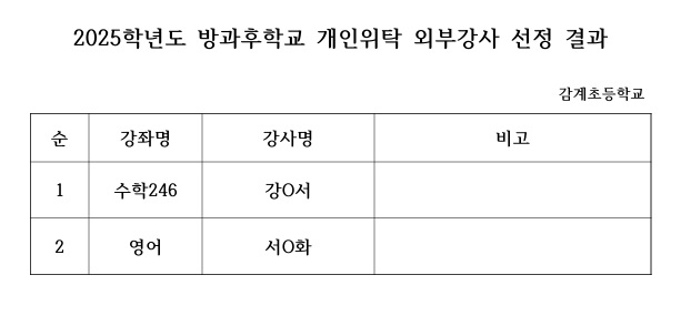 2025학년도 방과후학교 개인위탁 외부강사 최종 선정 결과를 안내드립니다.
