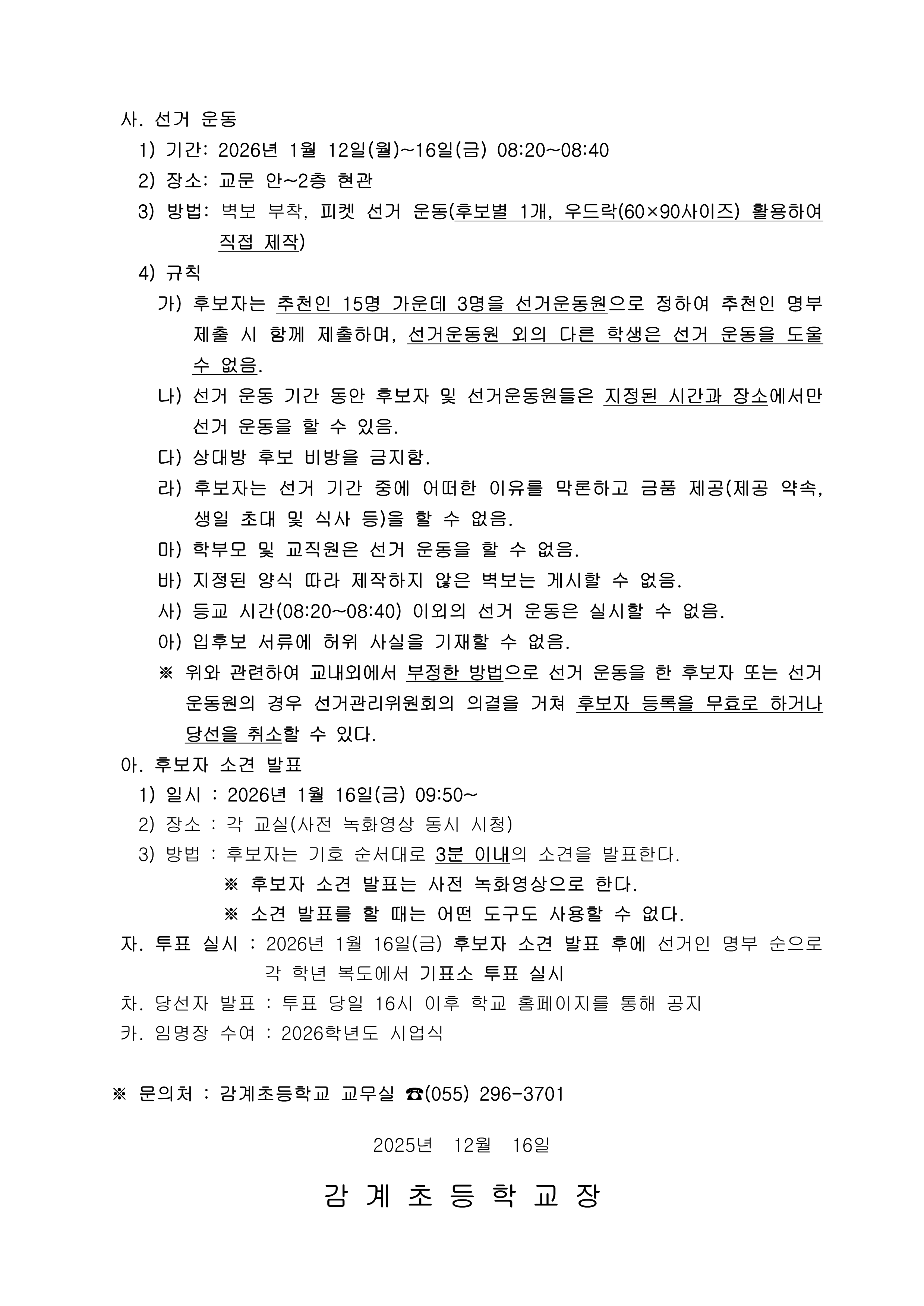 2026학년도 감계초등학교 전교학생자치회 임원 선거 공고